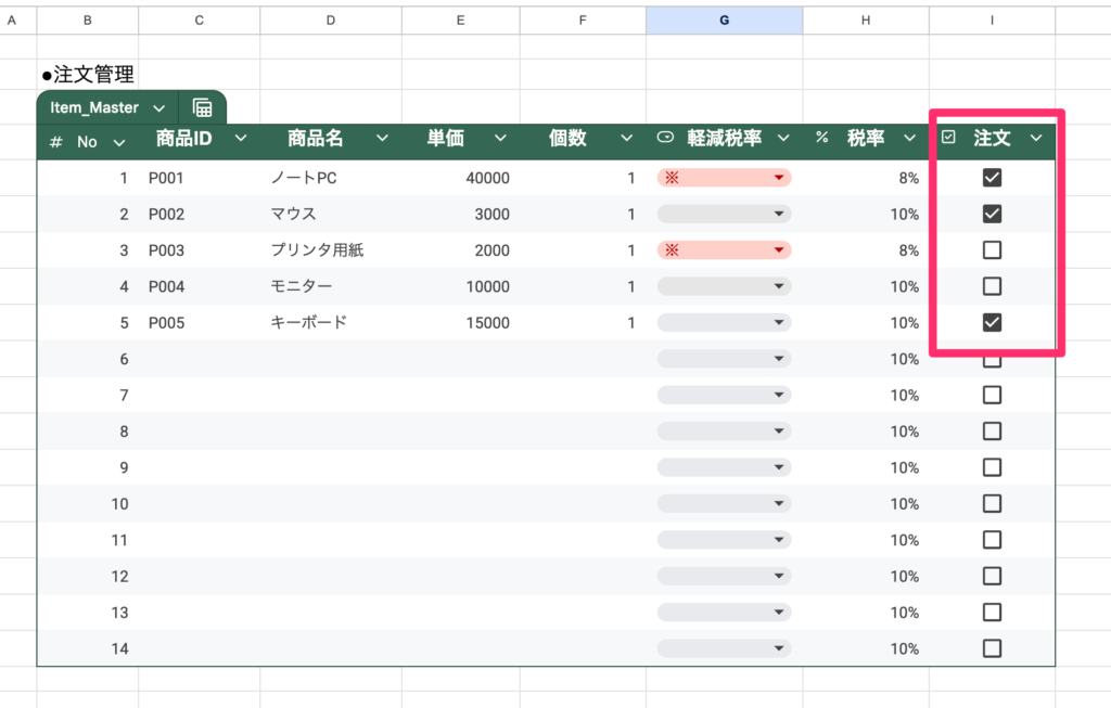 そこで今回ご紹介するのが、商品一覧でチェックを入れると、自動で注文書に反映されるスプレッドシートです。